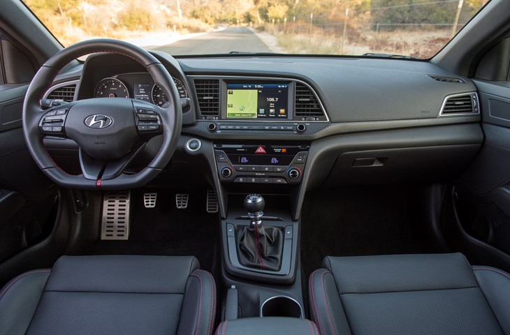 Inside, Elantra Sport builds on the Hyundai Elantra’s award-winning user experience – recently named one of Wards 10 Best. Heated leather sport seats with more aggressive bolstering are standard along with eye-catching red contrast stitching, a flat-bottomed leather-wrapped steering wheel, leather-wrapped shifter, and a black headliner. Hyundai’s intuitive AM/FM/HD/SiriusXM 7” Display Audio system with Android Auto and Apple CarPlay is part of the extensive standard-equipment list, which also includes a proximity key with push-button start. Alloy pedals and a Sport exclusive instrument gauge cluster provide even further differentiation from the rest of the Elantra line-up.