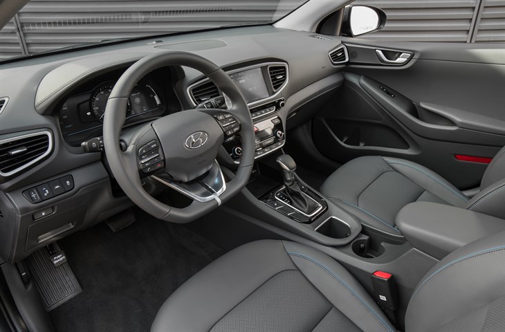 The driver and passenger of the Electric model will also notice that there is more room between the front seats. This is achieved via a button-activated shift-by-wire system free of mechanical linkage. The Ioniq also features an electronic parking brake (EPB), conserving space in the center console.