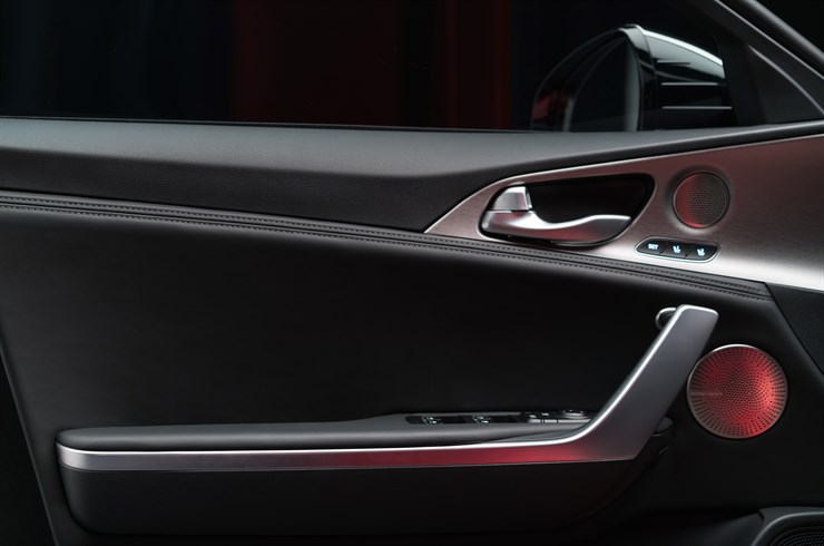 The wide front and rear track, along with the recessed contours along the doors, enhance the visual power of the Stinger’s shoulder line as well as its fastback silhouette. Other purely functional elements of the exterior design – the front air curtains, wheel arch gills, smooth underbody, and integrated rear diffuser – aid its aerodynamic efficiency. The rear valance houses four oval exhaust pipes. Kia’s signature ‘tiger-nose’ grille sits proudly between complex LED headlamps.