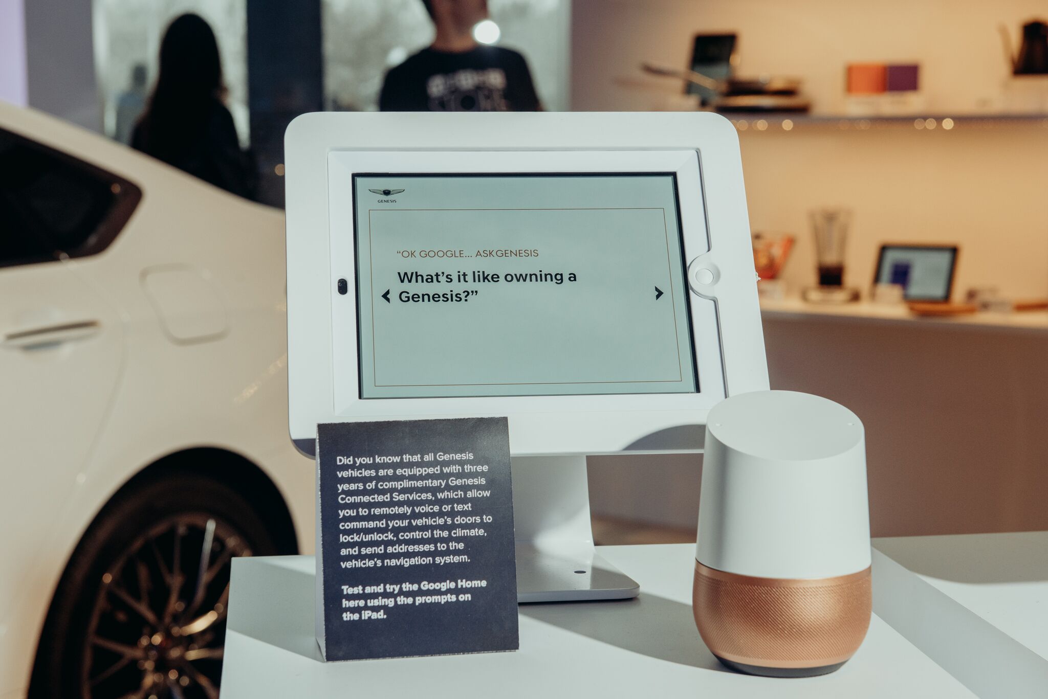 [ads id=”0″ style=”float:left;padding:6px;”]For those who’ve only read about connected homes and connected cars in the likes of WIRED, the store includes two dedicated activation areas – courtesy of a Google Home, and an iPad Pro – where guests may interact with the G80’s standard Genesis Connected Services technology. Guests may prompt either device to send a destination to the car’s navigation system or to remotely engage the vehicle’s locks and lights. A popular feature with Genesis clientele during warm and cold seasons alike — remote starting the car with preferred climate control settings — won’t be demonstrated during the indoor display.