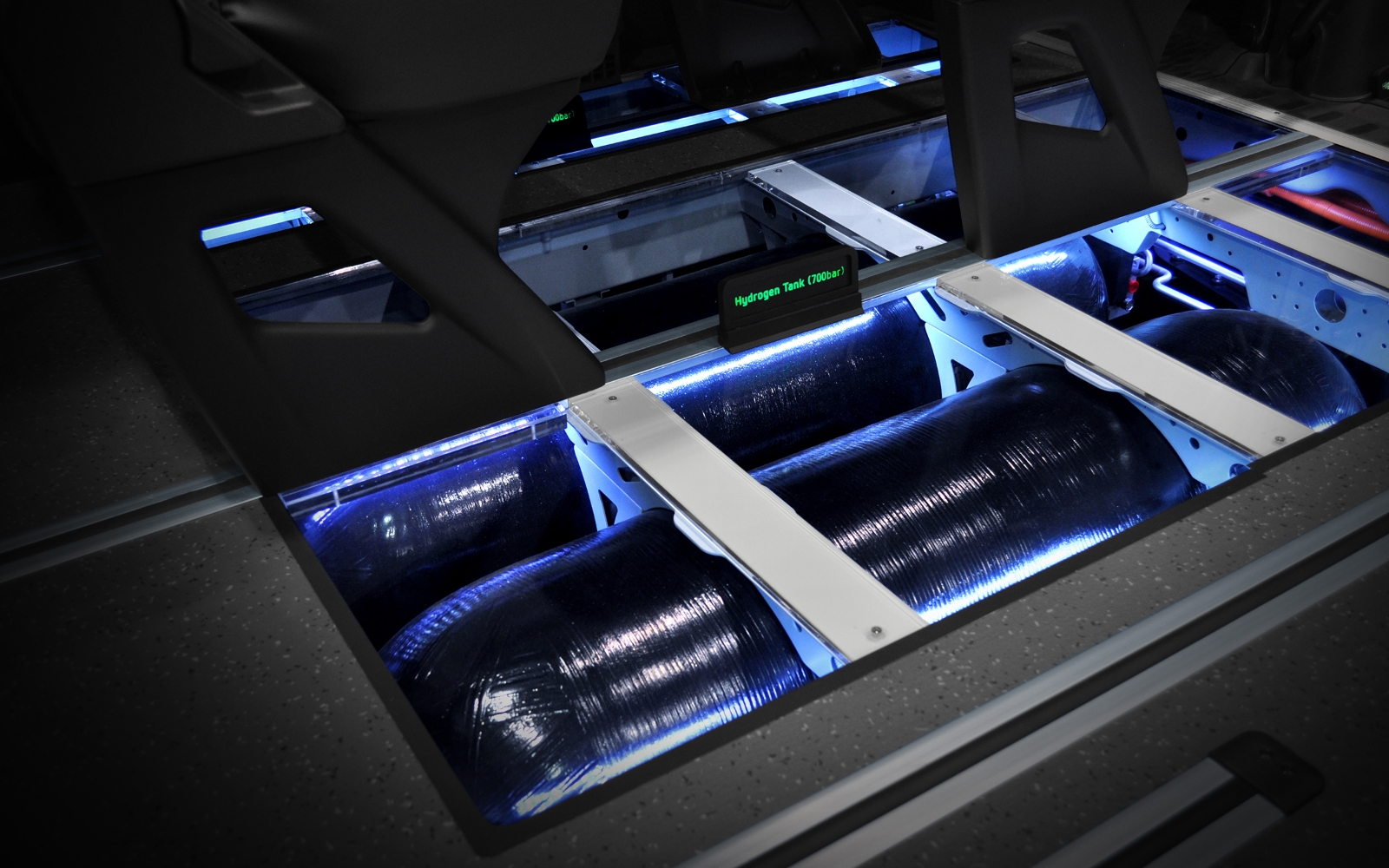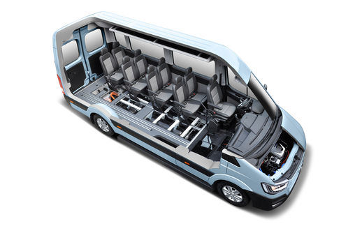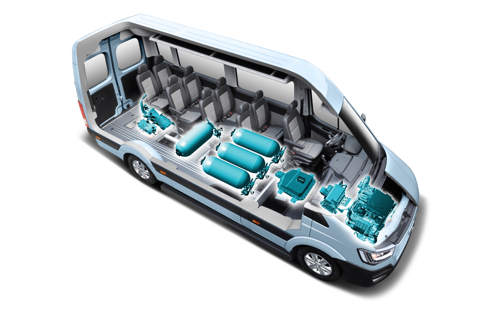 The H350 has an 100 kw (136hp) engine and let the bus accelerate to around 150 km/h without noises. The Engine and tanks of the vehicle are build into the floor and give the 14 passengers no restriction on luggage or space. This means there are no drawbacks compared to other engines like diesel or gasoline.