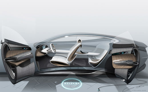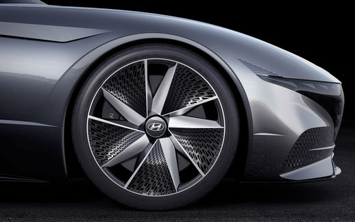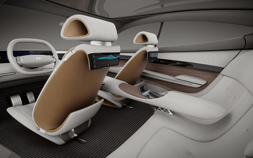 A core design principle for Hyundai designers was to create a design that enables a seamless experience of function. Inspired by aircraft ventilation, a two-way air ventilation system blows air over the curved surface of lightweight tube architecture. Revitalised wood and high-tech fabrics are used extensively throughout and sculpted into exquisite, sensuous forms. This evokes natural beauty with an emotional touch to add an airy feel to vehicle. Meanwhile, a panoramic floating display coupled with haptic technology sits in front of the driver, providing access to intuitive controls for climate control and other vehicle configurations.
