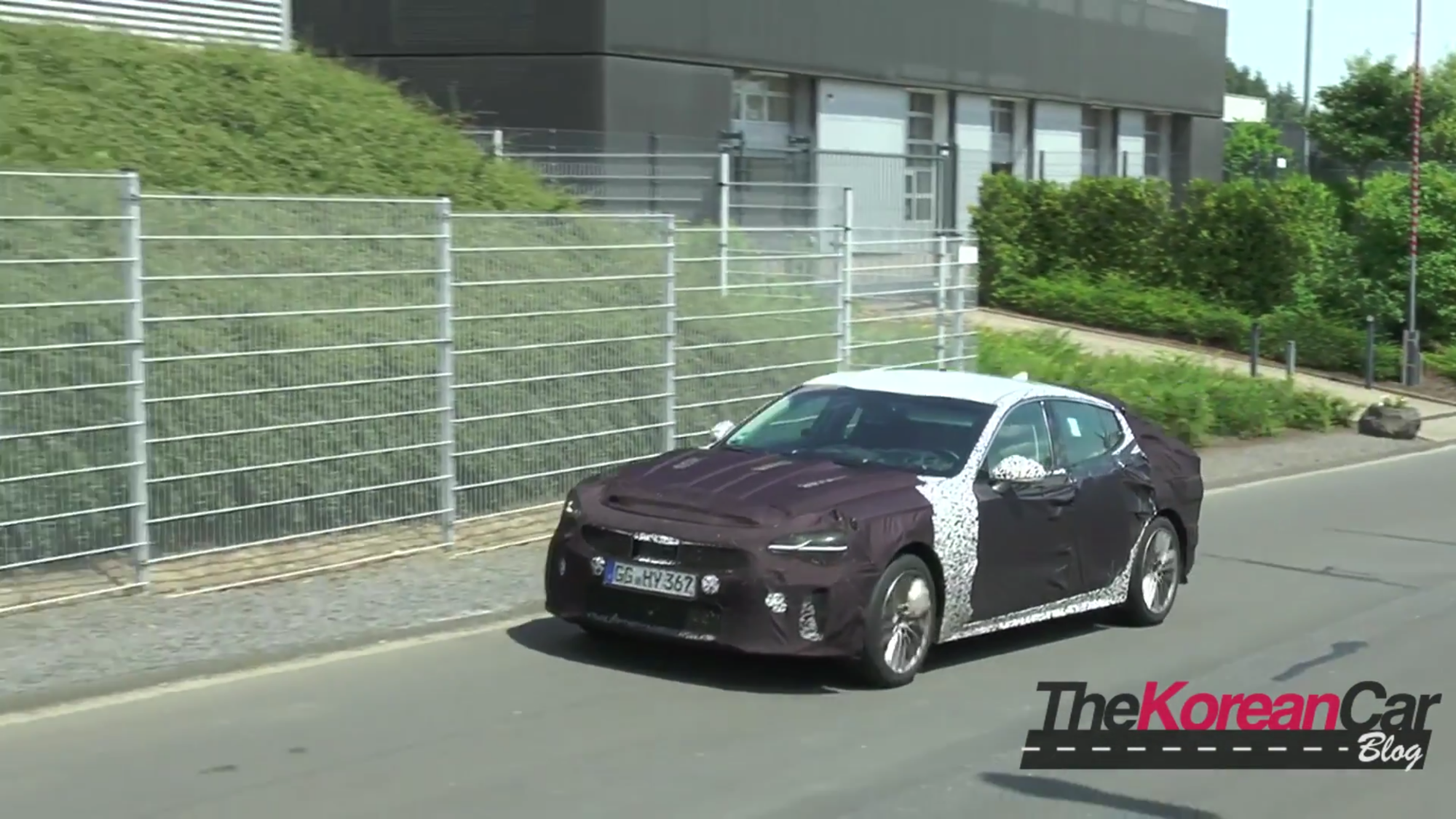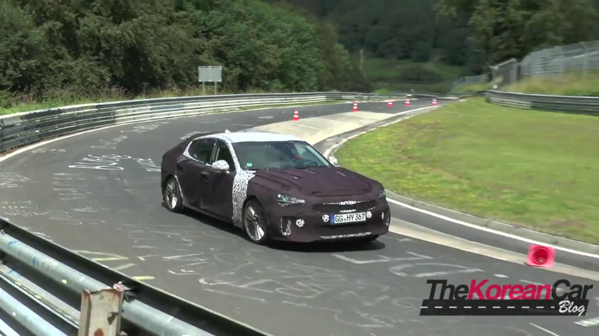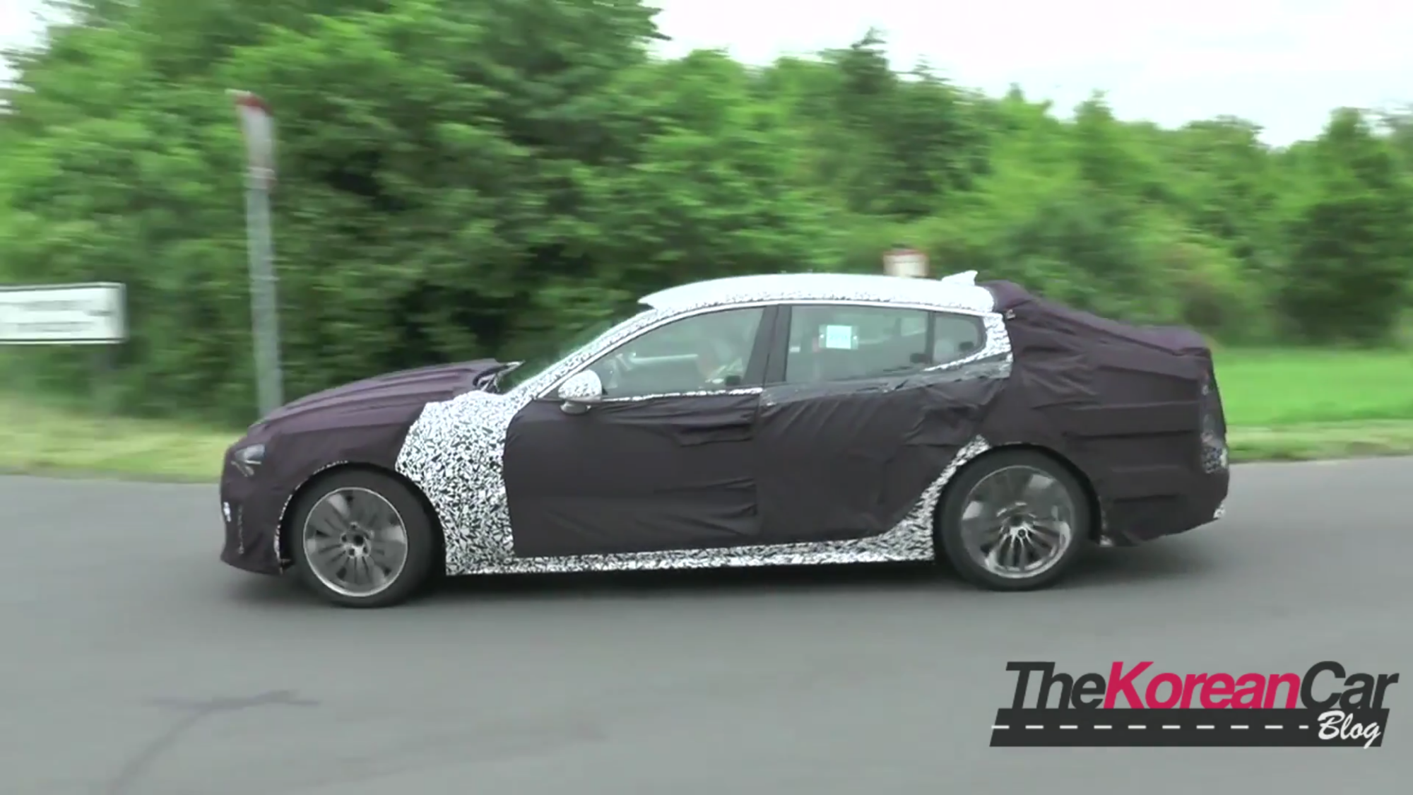 In viewing the GT racing uphill and out of a corner with the tires squealing, its safe to speculate that the car has a bigger motor possibly the 3.3 twin turbo. Although slightly quiet, we can see it in some footage of the car pulling away from a Mercedes. Furthermore, we can also see that Kia is not holding back on testing the GT, considering that the car is fitted with a 4-point roll bar for driver protection.