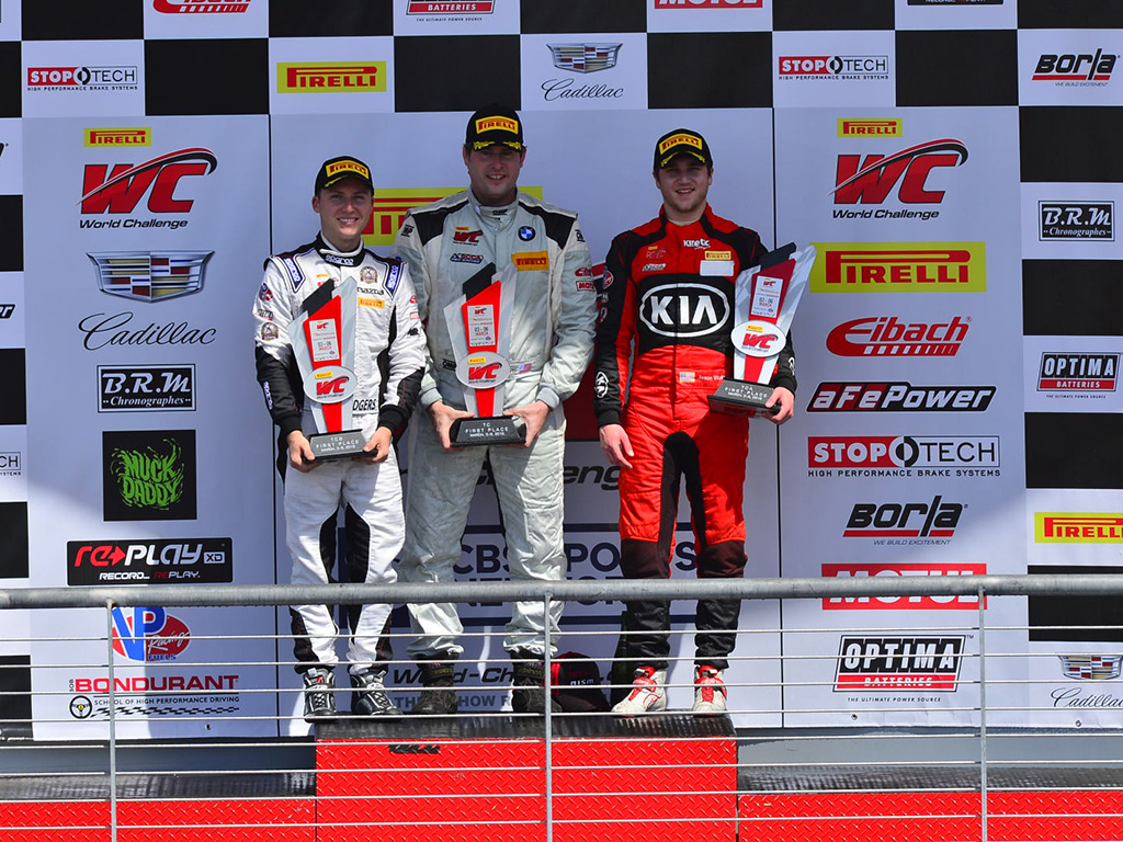 [ads id=”0″ style=”float:left;padding:9px;”]On the 2nd race Jason Wolfe in the Forte Koup took charge in TCA on the opening round of the 2016 Pirelli world challenge. Without missing a beat, the two-time class champion took the lead by overtaking Goulart in the No. 70 Mazda MX-5 Cup car on the start over. In the 3rd Lap, Wolfe aggressively defended his lead position over Goulart, and Senguin in the No 32 Honda Civic Si. By lap 3, other competitors wanted a piece of the action by Drake Kemper in the No 21 Mazda MX-5 taking Senguin’s position and aiming for the top.Although Jason Wolfe, continually and successfully remained in the lead, competitors were fiercely fighting for 2nd and 3rd but Eric Powell in the No. 23 Mazda MX-5 took Kemper’s 3rd place position. During Lap 10 Goulart made an impressive move and took lead from Wolfe however, Wolfe took the lead back which became a door to door battle between the Forte Turbo and Civic Si for several laps.It was the final lap for the 2nd race and Wolfe had the lead, unfortunately there was a mechanical issue which was later diagnosed as possible fuel shortage in the Forte and although Wolfe defended the lead as best he could, Goulart managed to sneak past him on the final turn earning Jason Wolfe 2nd place.