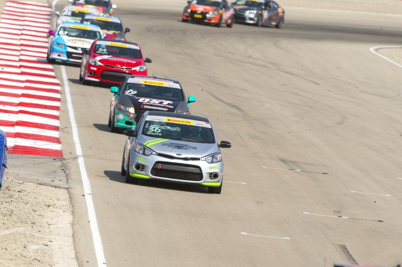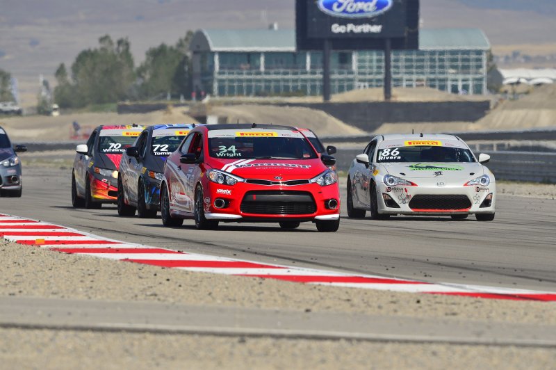 Based on fastest laps during round 13, Wilkins and Clucas started Sunday’s round 14 from third and fourth, respectively. Clucas’ No. 36 DonorsChoose.org Optima turbo got off to a tremendous start and moved up from fourth to second as the 19-car GTS field barreled into turn one. Once there, Clucas made a bold move deep in the braking zone to overtake the leader in turn five. He would lead for 12 laps, but ultimately, the desert heat and abrasive track surface would take their toll on the Optima’s front tires, leaving Clucas vulnerable to attack. After a grueling 50 minutes of racing, Clucas out-dragged Baldwin’s No. 73 Porsche Cayman by a mere .036 seconds for a photo finish to claim third place – his fourth podium of the season. Wilkins was not far behind, adding another top-five finish to Kia Racing’s record.