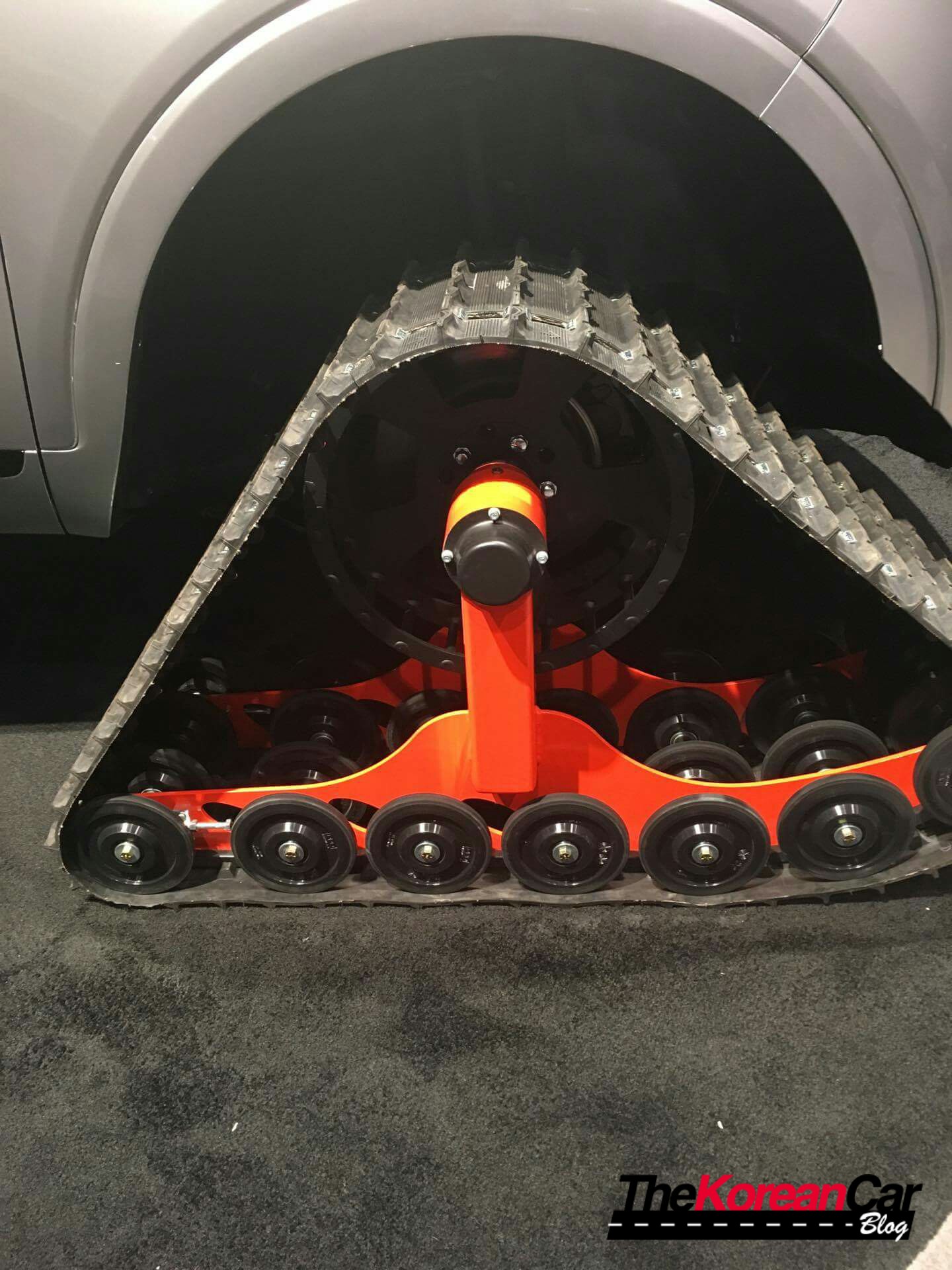 Dominator Rubber Tracks powdercoated orange make this gondola a go-anywhere cold-weather machine. A custom metal roof rack supplies ample storage for skis and poles while the cargo area provides abundant space for boots, bags and other gear, all easily accessible thanks to the removal of the B pillar and the rear doors being converted to suicide-style doors. Up front, the Sorento’s headlights were painted black, silver and orange and LED light bars were installed for increased visibility in all conditions.